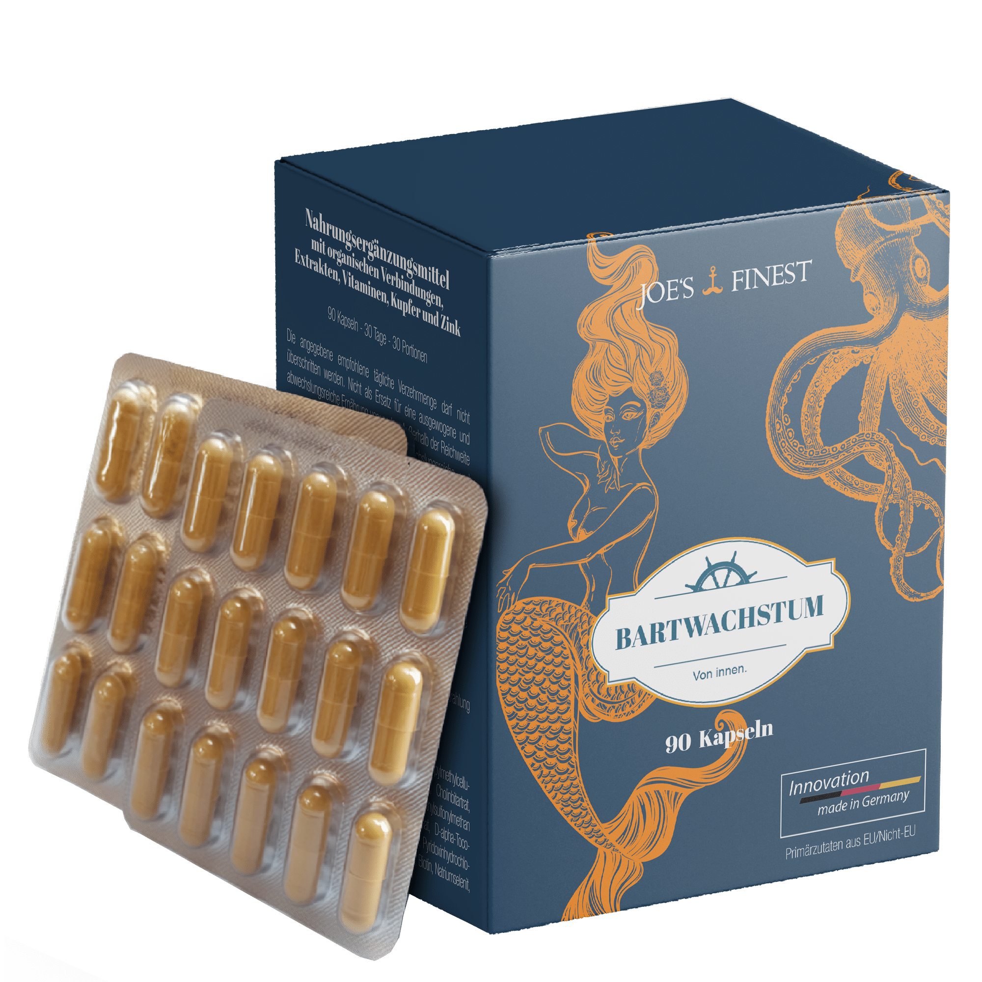 Joe’s Finest Bartwuchsmittel sind natürlich formulierte Nahrungsergänzungskapseln zur Unterstützung des Bartwachstums. Sie liefern essentielle Nährstoffe, Vitamine und Mineralstoffe, mit dem Ziel, den Bartwuchs anzuregen, die Haarstruktur zu stärken und Bartlücken zu reduzieren. Die Produkte wirken von innen heraus, ohne auf die Haut einzuschmieren.